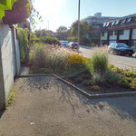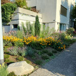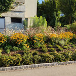 Neubepflanzung einer Rabatte mit pflegeleichten, trockenheitsresistenten und langblühenden Stauden. Eine gute Alternative zu Steinrabatten.